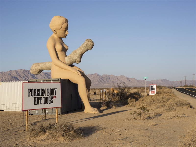 Paloma Varga Weisz - "Foreign Body" - 2022 - 8 m x 6 m x 7,5 m - Structure en acier, styrofoam, Acrystal Prima, containers de transport, enseignes peintes- Joshua Tree - Californie